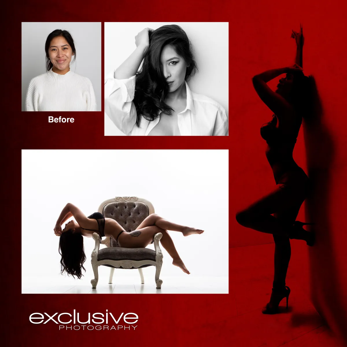 For over 40 years, Exclusive Photography has been creating empowering and unforgettable experiences through portrait, modelling portfolio, artistic, and glamour photography. Whether you want a timeless classic or something modern and bold, our award-winning photographers and stylists work closely with you to discover your unique style and bring it to life in a stunning collection of images.